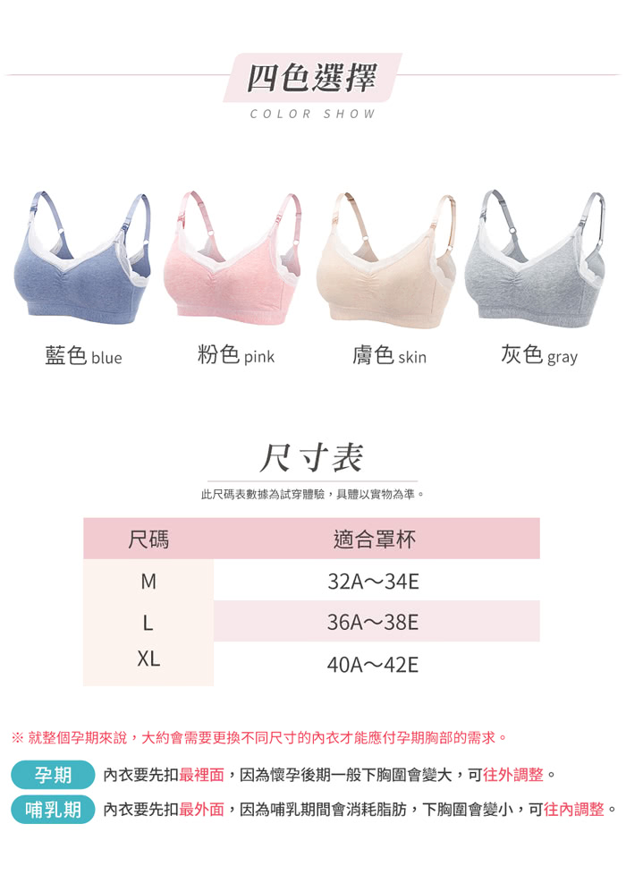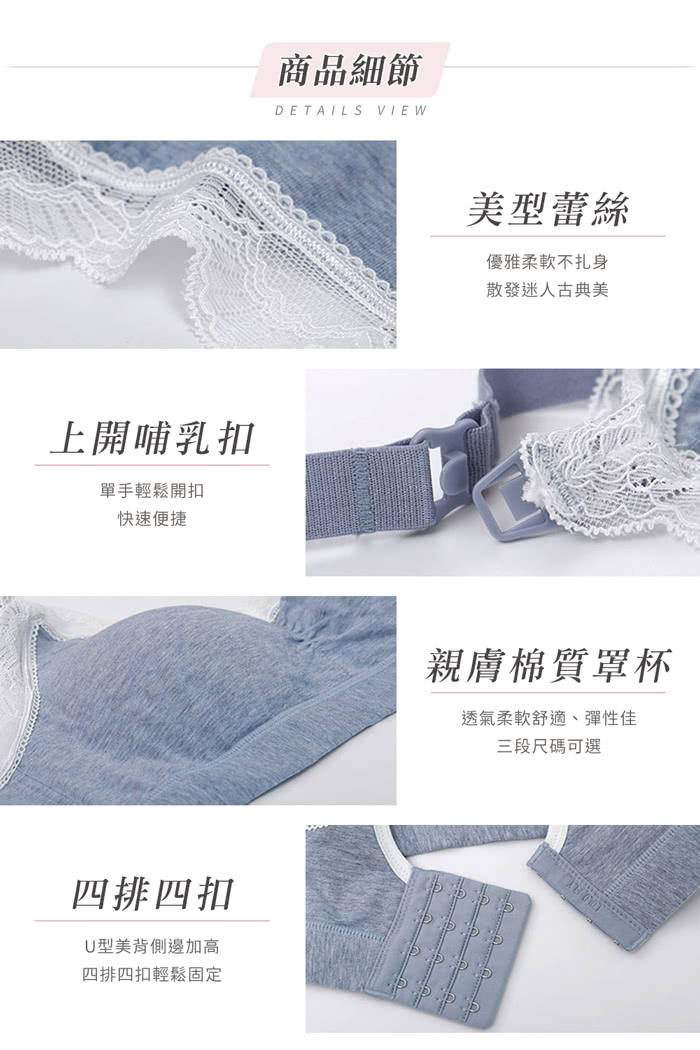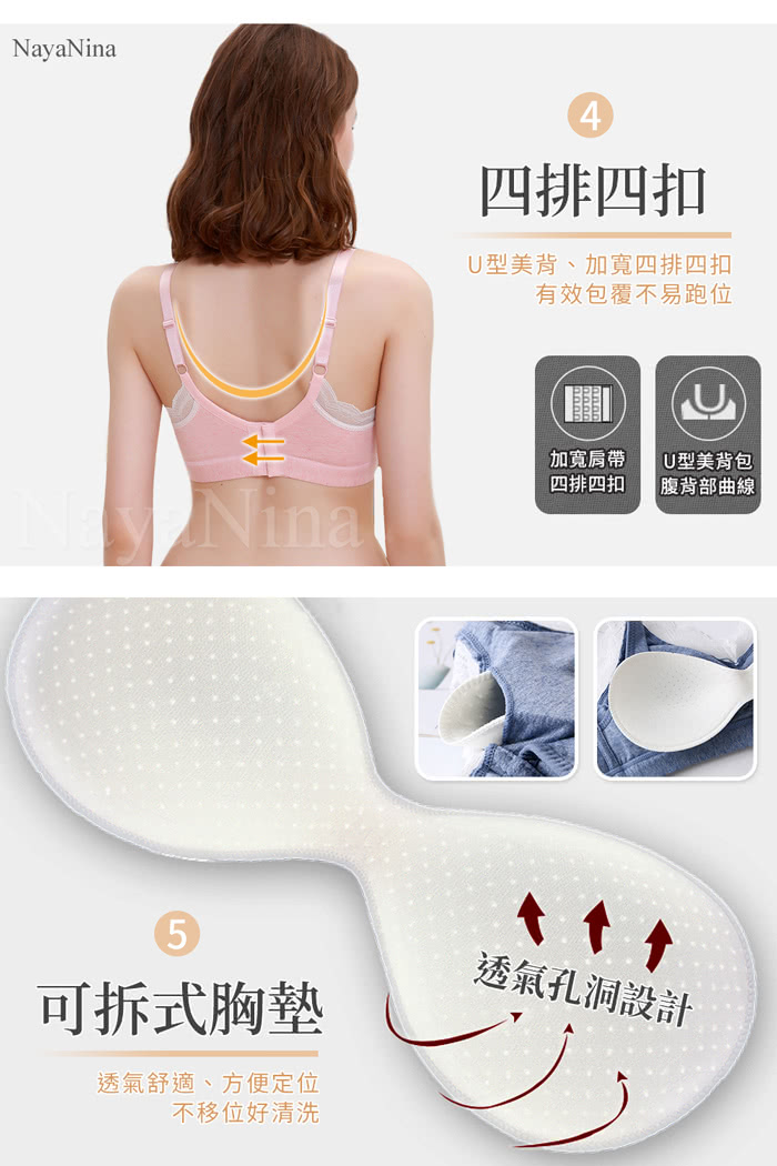胸罩內無鋼圈,後釦式穿法,背釦設計為4排4釦,適合準媽咪穿著,不壓迫脹奶的胸部